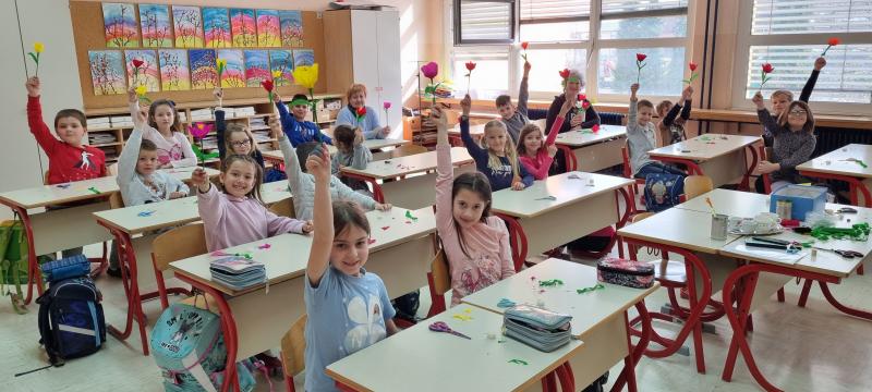 V 2.a, b in c razredu smo izdelali rožice za mami. Dejavnost sta vodili gospe Sonja in Marija.