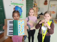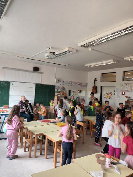 Tudi sicer v razredu veliko prepevamo. S harmoniko nas je v aprilu spremljal tudi Veronikin dedi Dane. Izdelali smo tudi vsak svoj instrument iz kartona/ harmoniko, kitaro, trobento in tako z "igranjem" spremljamo lastno petje.
