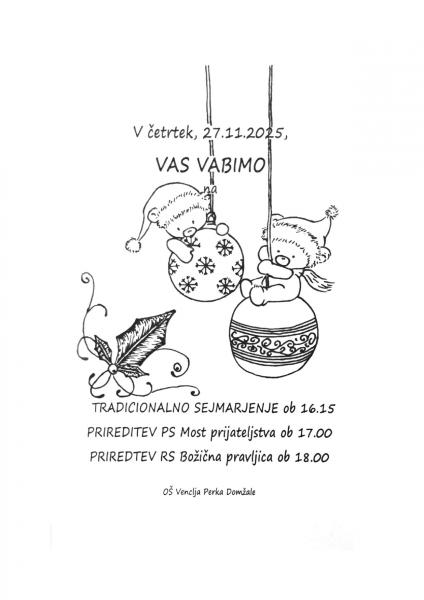 V četrtek, 27. 11. 2025, vas vabimo na tradicionalno sejmarjenje, ki ga bomo ob 16.15 odprli s prižigom lučk na šolski jelki na igrišču pred šolo. Stojnice se bodo znova napolnile z izdelki naših učenk in učencev ter njihovih učiteljic in učiteljev. Po šoli bo zadišalo po kostanju, sejemskih klobasah, vaflih in vroči čokoladi, vi, dragi starši, pa boste – kot vedno – poskrbeli za bogato izbiro doma pečenih piškotov.