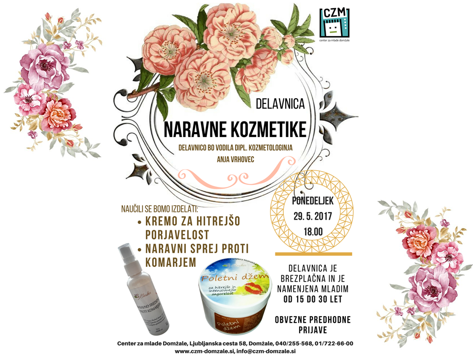 29. 5. 2017 ob 18.00 – Delavnica naravne kozmetike pod vodstvom dipl. kozmetologinje Anje Vrhovec